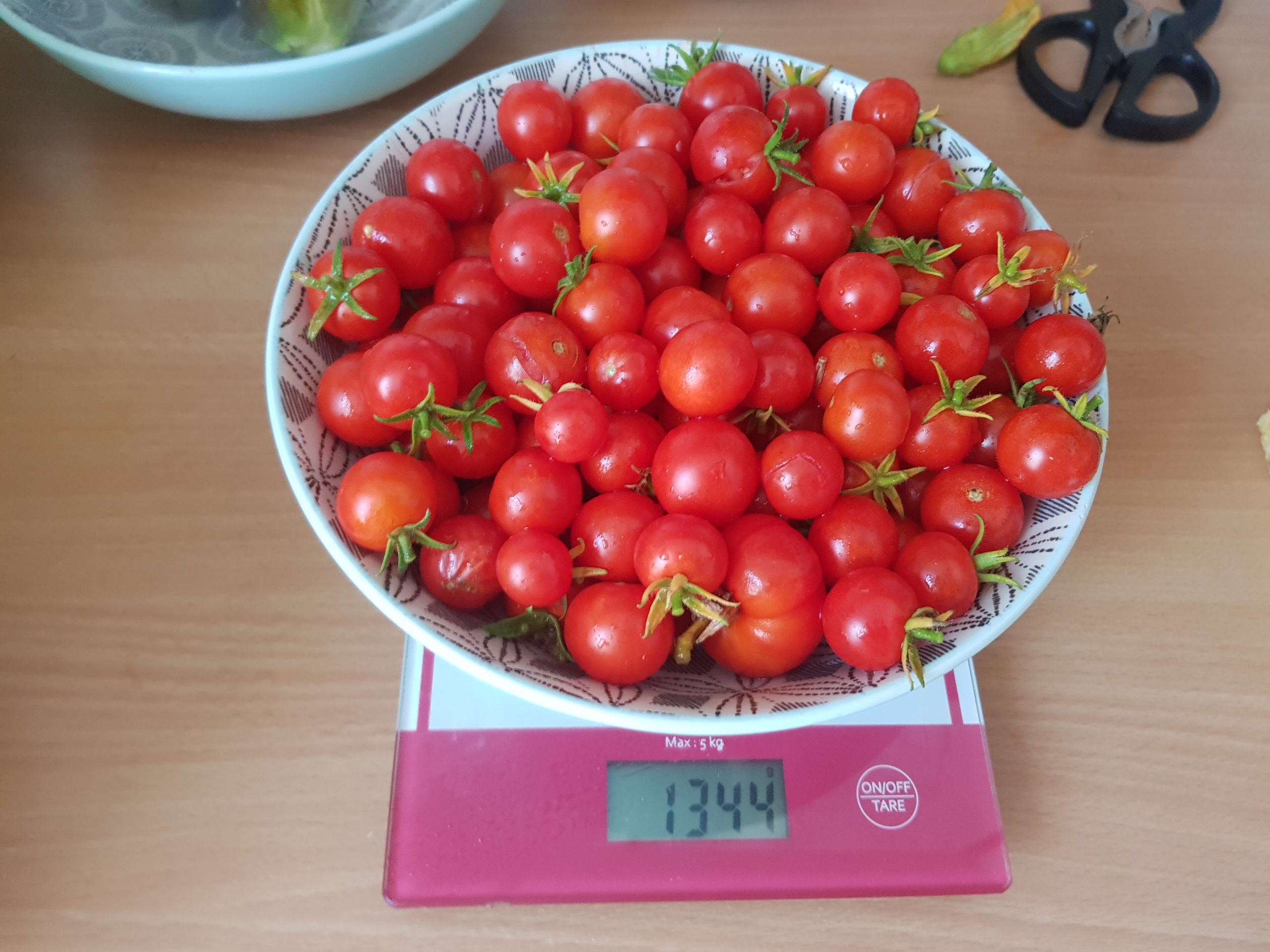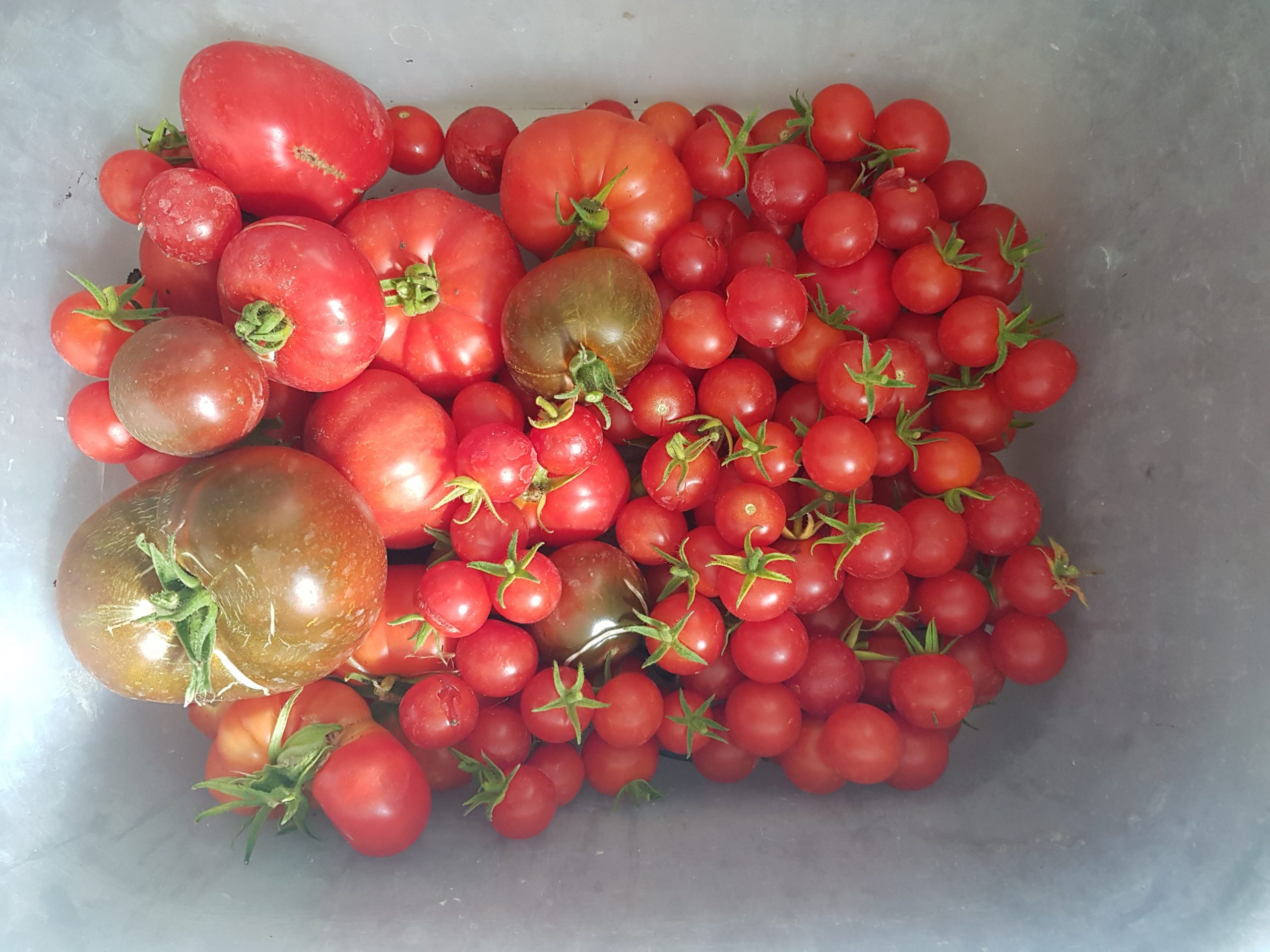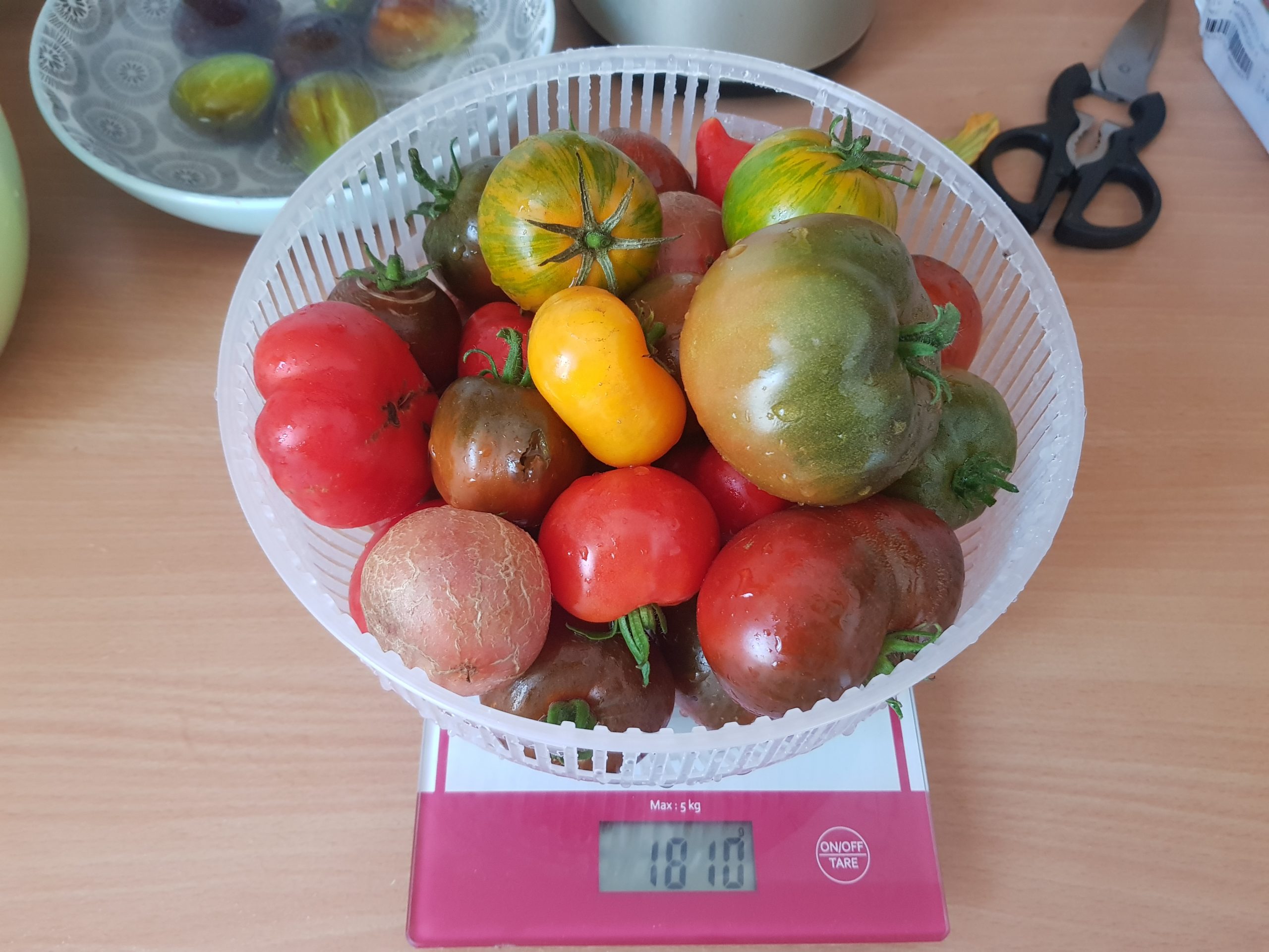 Ci-dessous, quelques récoltes pesées. Pour les tomates fraîches, toutes les variétés sont bonnes, surtout les miel, cerises, green zebra, noires de crimée, ananas etc…