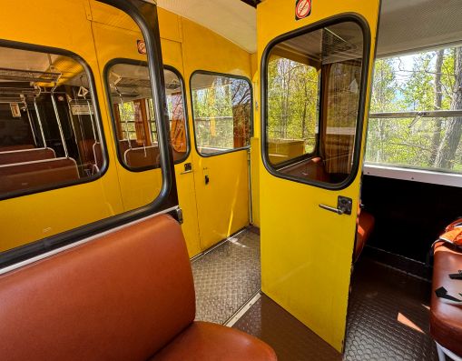 L’intérieur est aussi élégant. Des fauteuils en cuir brun, des petits radiateurs pour l’hiver, des rideaux aux fenêtres. A l’extérieur, se trouve un wagon à ciel ouvert. Sur ses petits bancs en bois, on pourra s’installer comme dans un manège en profitant du grand air.